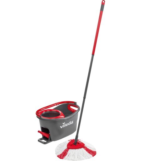 Das Vileda Wischmop Turbo EasyWring & Clean Box Komplett Set besteht aus einem reinigungsstarken Wischmop und einem funktionalen Eimer mit integrierter Power Schleuder. Nach dem Wischen steckt man den Wischmop in die Power Schleuder und bedient das integrierte Pedal mit dem Fuß. Der aufgenommene Schmutz und das überschüssige Wasser werden in den Eimer geschleudert und man erhält die optimale Feuchte des Wischbezugs, je nach Bodenbelag. Der Vileda Turbo Rotationseimer ist mit einem ergonomischen Tragegriff ausgestattet. Im Haltegriff ist eine Halterungsöffnung eingelassen, in die sich der Stiel einrasten lässt. Über die Ausgussöffnung kann das Wasser bequem und ohne Spritzer ablaufen. Der Wischmop säubert Fliesen ebenso effizient wie Laminat und Parkett, und der 2-in-1-Wischkopf beseitigt Flecken und Schmutz schnell und zuverlässig. Die patentierte Kombination aus Micro- und Kraftfasern ist dabei auf verschiedene Anforderungen ausgerichtet. Die roten Kraftfasern nehmen Haare, Krümel und anderen Schmutzpartikel bis zu 20 Prozent besser auf als die weißen Fasern. Diese weicheren Microfasern besitzen dagegen eine besonders starke Saugleistung und entfernen auch eingetrockneten Schmutz und fetthaltige Flecken. Der Faser-Mix verhindert außerdem Streifen- und Schlierenbildung beim Wischen. Ein Gelenk in Bodennähe ermöglicht es, auch schwer zugängliche Flächen unter Möbeln und Heizkörpern bequem zu erreichen. Dank der Delta-Form der Faser-Halterung glänzt der Boden außerdem in jeder einzelnen Ecke. Damit der Rücken während der Arbeit geschont wird, kann man den Teleskopstiel in Sekundenschnelle anpassen, er lässt sich stufenlos auf eine Länge zwischen 85 und 130cm einstellen. Nach dem Wischen lassen sich die Microfasern einfach vom Wischkopf abnehmen und in der Waschmaschine reinigen. Sie sind für die Maschinenwäsche bei bis zu 60°C ausgelegt. ...