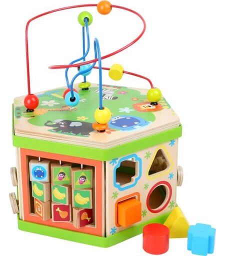 Dieser Motorikwürfel aus Holz bietet vielfältige Spielerlebnisse auf sieben Spielflächen. - Motorikwürfel aus robustem Holz mit fröhlichen Tiermotiven - Spiel- und Lernspaß auf insgesamt 7 bespielbaren Flächen für langanhaltende Beschäftigung - inkl. Rechenschieber, Schiebe- und Steckspiel, Motorikschleife und weiteren Elementen zur Schulung der kindlichen Motorik - das Würfelinnere bietet Stauraum für die Steckelemente - trainiert gleichermaßen Fein- und Grobmotorik sowie die Hand-Augen-Koordination - fördert Neugier- und Entdeckerdrang - schult das spielerische Erfassen und Begreifen von Mengen - mit besonders ansprechenden Tier-Illustrationen bedruckt Maße: ca. 29 x 25 x 30 cm, Spielhöhe ca. 17 cm Material: Holz, Metall Einzigartiges Design made in Germany. Verantwortung für Qualität und Sicherheit damit Kinder unbeschwert spielen können. Liebe zum Holz weil es nachhaltig begeistert. ...