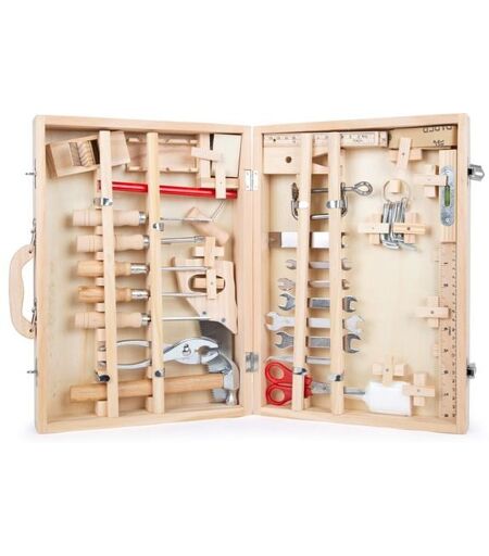 Werkzeugkoffer Deluxe Das Nonplusultra unter den Werkzeugkoffern: Klappbarer Holzkoffer mit 48 Teilen für kleine Heimwerker! Hier ist für jeden Fall das passende Werkzeug enthalten - vom Lineal und Zimmermannsbleistift über diverse Schraubenschlüssel, Steckschlüssel und Imbusschlüssel bis zu Hammer, Säge und Stechbeitel! Jeder Artikel im Koffer hat seinen festen Platz und ist mit Sicherungen versehen, sodass beim Transport nichts durcheinander fällt. Für kleine Handwerker im Metall- und Holzbereich unerlässlich! ...