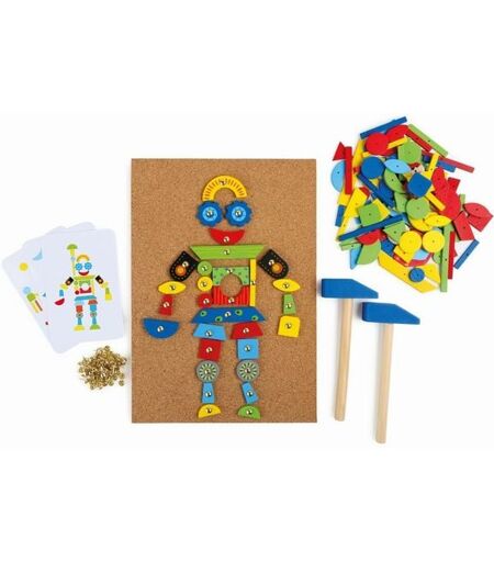 Hör mal wer da hämmert! Ein elastisches Korkbrett, zwei kleine Holzhämmerchen, 100 kleine Nägel und 126 kunterbunte Holzteile geben den Startschuss um ein individuelles Bild zu gestalten. Mit 6 Bildvorlagen und Aufbewahrungsbox! Hier sind der Fantasie keine Grenzen gesetzt. Ob Roboter, Zug oder Rakete hier ist alles möglich. Wer noch Ideen sucht, schnappt sich einfach die sechs Bildvorschläge und los gehts! Maße: Korkplatte ca. 30 x 21 x 1 cm, Hammer ca. 16 x 2 x 6 cm ...