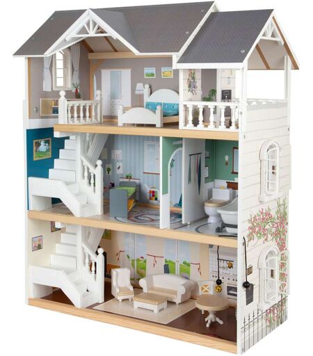 Mit seiner umfangreichen Zimmer- und Mobiliarausstattung bietet das Puppenhaus Stadtvilla von small foot großes Spielvergnügen für Kinder ab drei Jahren. Puppenhaus Stadtvilla von small foot Wohnküche und Wohnzimmer, Schlafzimmer, Kinderzimmer, Bad und Loggia über 3 Etagen mit 2 Treppen echte Glocke zum Klingeln, Schiebetür, zu öffnende Fenster, Nachtkästchen mit Schubladen und umfangreiches Mobiliar mit offener Front für bis zu 12 cm große Puppen ca. 63(L) x 32(B) x 76(H) cm, Ehebett ca. 14(L) x 13(B) x 11(H) cm Puppenhaus aus Holz, Mobiliar aus Kunststoff mit Holz- und Stoffdetails ab 3 Jahren geeignet Das Puppenhaus Stadtvilla ist aus Holz hergestellt und punktet mit robuster Eigenschaft. Mit einer Höhe von insgesamt 76 Zentimetern – verteilt auf drei Etagen – eignet sich das Haus ideal für Puppen mit einer Größe von bis zu 12 Zentimetern. Die offene Front ermöglicht das gleichzeitige Spielen mehrerer Kinder und erleichtert den Zugang zu den einzelnen Zimmern. Für ein realitätsnahes Spielerlebnis sind alle Räume mit umfangreichem Mobiliar ausgestattet: Eine Wohnküche mit einem Tisch und zwei Stühlen sowie ein Wohnzimmer mit Sessel, Sofa und Couchtisch mit Schublade befinden sich im Erdgeschoss. Das Bad mit Schiebetür, Toilette und Badewanne sowie das Kinderzimmer mit Etagen-Bett befinden sich im ersten Stockwerk. Im zweiten Obergeschoss ist das Schlafzimmer: Dieses verfügt über ein Ehebett und zwei Nachtkästchen mit Schubladen und ist an die nebenan liegende Loggia angeschlossen. Damit die Puppen ganz leicht die Zimmer und Stockwerke wechseln können, sind die Etagen über zwei Treppen miteinander verbunden. Die Außenfassade punktet mit einer echten Glocke zum Klingeln, zu öffnenden Fenstern und einer detailreichen, aufgedruckten Gestaltung: Eine Hausnummer, ein Briefkasten, ein Zaun, Blumenranken und das an die Laterne angeschlossene Fahrrad geben dem Puppenhaus ein realitätsnahes Außendesign. ...