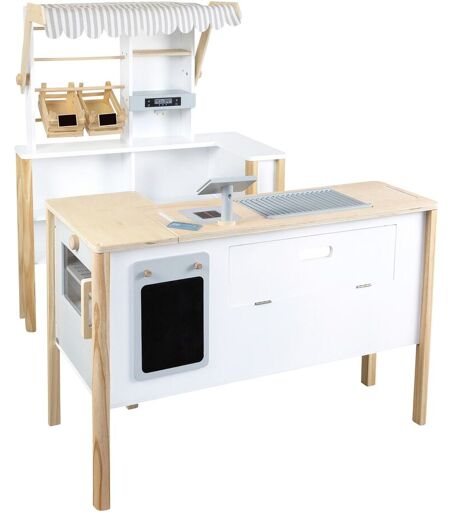 Der Kaufladen fresh von small foot überzeugt mit seiner modernen Ausstattung und vielfältigen Spielmöglichkeiten. Kaufladen fresh von small foot 2 Korpusse mit Kochplatte, Backofen, Kühlschrank, Spüle, Wasserhahn, Grillbereich, Kaffeemaschine, Kasse, Scanbereich mit Display und Kassenband inkl. 2 Verkaufskörbe mit Preisschildern, Angebotstafel und abnehmbarem Markisenbezug flexibel verwendbar als Kaufmannsladen, Kiosk, Imbiss, Marktstand, Küche oder Café ca. 106(L) x 40(B) x 106(H) cm, Arbeitshöhe ca. 60 cm Korpusse aus Holz, Markisenbezug aus Stoff ab 3 Jahren geeignet Der Kaufladen fresh besteht aus zwei Korpussen aus massivem Holz, die sich je nach Platzangebot und Spielidee platzieren lassen. Dank der umfangreichen Ausstattung mit flexiblen Einsatzmöglichkeiten lässt sich der Kaufmannsladen kinderleicht in einen Kiosk, einen Imbiss, einen Marktstand, eine Küche oder in ein Café verwandeln: Die Kasse lässt sich auch als Spüle verwenden. Das Kassenband kann zur Kochplatte oder zum Grillbereich umfunktioniert werden - und die Kühltheke ist im Nu zum Backofen umgebaut. Zusätzlich im Lieferumfang enthalten sind ein Scanbereich mit Display, zwei Verkaufskörbe mit Preisschildern, eine Angebotstafel, ein abnehmbarer Markisenbezug und eine Kaffeemaschine. So können zahlreiche Alltagssituationen nachgespielt werden, bei denen Dein Kind und seine Freunde in die Rolle des Käufers oder Verkäufers schlüpfen können. Die Arbeitshöhe liegt bei ungefähr 60 Zentimetern. Damit eignet sich der multifunktionale Kaufladen für kleine Küchenchefs sowie Café- und Kioskbetreiber ab drei Jahren. Praktisch: Nach dem Spielen lassen sich die Module platzsparend zusammenschieben. Kinder und Fachkräfte sind vom Kaufmannsladen begeistert. Darum wurde er auch mit dem „spiel gut“-Siegel ausgezeichnet – eine der wichtigsten und renommiertesten Auszeichnungen für gutes und pädagogisch wertvolles Spielzeug in Deutschland. Hinweis Der Markisenbezug kann abweichen. ...