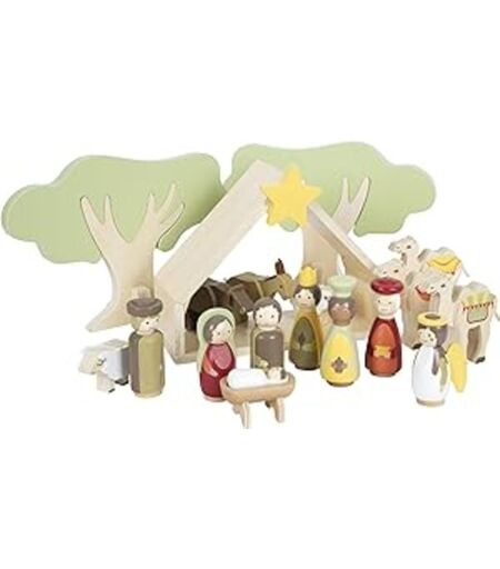 Mit diesem umfangreichen, kindgerechten Komplettset aus Holz erwacht die Weihnachtsgeschichte im Kinderzimmer zum Leben! Das liebevoll gestaltete Spielset mit hohem sichtbarem Naturholzanteil und der natürlichen Farbgebung eignet sich ideal als zeitgemäße und dennoch traditionelle Weihnachtsdekoration! Beim Nachspielen und Nacherzählen der Weihnachtsgeschichte mit den handschmeichlerischen Figuren kommt bei Groß und Klein spielend Weihnachtsstimmung auf. Figuren ideal für kleine Kinderhände geeignet! Was wäre Weihnachten ohne Krippenspiel? Das Weihnachtskrippen-Komplettset besteht aus zwei Bäumen zum Zusammenstecken, einem Holzstall mit Steckstern und (Futter)Krippe, drei Kamelen, einem Esel, einem Ochsen und zwei Schafen. Das Figuren-Set umfasst einen Hirten, drei Könige, einen Engel sowie Maria, Joseph sowie das Jesuskind, das im Spiel aus seiner Krippe genommen werden kann. Alle Figuren mit Vollholzkopf! Für echten Spielspaß sorgt bei den dreidimensional gestalteten Spiel-Elementen der sichere Stand. Praktisch: Durch das Stecksystem können die Bäume platzsparend bis zum nächsten Weihnachtsfest verstaut werden. Maße cm: Krippe: ca. 11 x 22 x 18 cm; König: Höhe: ca. 9 cm, Ø ca. 3 cm Inhalt:1 Krippe, 2 Schafe, 1 Kuh, 1 Esel, 2 Bäume, 3 Kamele, 1 Baby, 1 Bett, 7 Menschen. ...