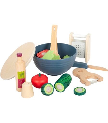 Das Schneide-Set Salat fresh von Small Foot bietet Kindern ein fröhliches Motoriktraining. Zugleich beschäftigen die Minis sich spielerisch mit dem Thema Ernährung. Schneide-Set Salat fresh von Small Foot 11 Teile: Schüssel mit Deckel/Schneidebrett, Gemüsereibe, Salatzange, Ölflasche, Salzstreuer, Gemüseschäler, Messer, Gurke, Salat, 2 Tomaten Gurke und Tomaten mit Klettverbindungen, Salatkopf mit abnehmbaren Blättern aus Holz, Filz, Kunststoff, Gummi ab 2 Jahren geeignet Mit dem Schneide-Set Salat fresh von Small Foot können Kinder ab zwei Jahren ihren großen Vorbildern nacheifern. Die Minis können das aus Holz und Filz gefertigte Gemüse mit dem Messer zerteilen und einen leckeren Salat anrichten. Der Deckel der Schüssel dient ihnen als Schneidebrett. Zubehör wie eine Gemüsereibe, eine Ölflasche und ein Salzstreuer gestalten das Spiel möglichst realistisch. Mit jeder Menge Spaß trainieren die Kids ihre motorischen Fertigkeiten. Sie beschäftigen sich mit dem Thema Ernährung und können sich gemeinsam mit anderen kreative Rollenspiele ausdenken. Soll das Spiel von vorn beginnen, lässt sich das Gemüse dank praktischer Klettverschlüsse einfach wieder zusammensetzen. ...