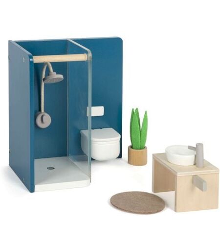 Moderne Wohlfühloase fürs Puppenhaus! Das Badmöbel-Set fürs Puppenhaus bringt frischen Wind in jedes Puppenhaus und ist mit seinen liebevoll gestalteten Details und praktischen Funktionen ein unverzichtbarer Bestandteil jeder Puppenhaus-Einrichtung. Im Zentrum des Sets steht eine moderne, begehbare Dusche mit einer eleganten Acrylglas-Duschwand. Die Duschbrause ist in der Höhe verstellbar und passt sich damit perfekt an jede Spielsituation an. Ein passender Duschvorleger rundet das Ensemble ab und sorgt für zusätzlichen Komfort. Das hängende WC besticht durch sein realistisches Design. Der klappbare Toilettendeckel lädt zu realistischen Rollenspielen ein und ermöglicht es den Kindern, den Badezimmeralltag detailgetreu nachzuspielen. Das Aufsatz-Waschbecken ist mit einem modernen Unterschrank ausgestattet. Der Handtuchhalter sorgt für Ordnung. Eine kleine Grünpflanze ergänzt das Set und bringt einen Hauch von Natur ins Puppenhausbadezimmer. Mit diesem Spielset wird das Badezimmer zum Lieblingsort der Puppenfamilie, an dem Pflege und Hygiene spielerisch erlebt werden kann! Das Puppenhausmöbel-Set Bad fördert spielerisch die Kreativität und die motorischen Fähigkeiten von Kindern. Durch das Nachspielen alltäglicher Badezimmerszenen im Puppenhaus entwickeln Kinder ein Verständnis für Alltagstätigkeiten und verbessern gleichzeitig ihre motorischen und sozialen Fähigkeiten. Ein Set, das Funktionalität und Design perfekt kombiniert. 1 Badezimmerecke mit Dusche und WC, 1 Duschvorleger, 1 Pflanze, 1 Waschbecken ...