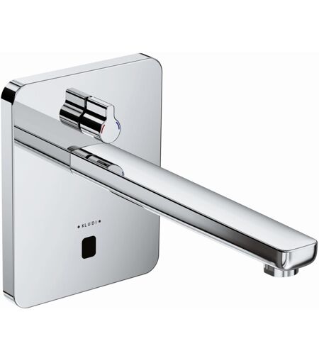 KLUDI ZENTA Elektronische Waschtischarmatur DN 15 Feinbau-Set soft-edge Rosette mit Stromversorgung über 230 V Netzgerät oder 6 V Lithium Batterie CR-P2 Wandmontage Temperaturwahlgriff Strahlregler M 24 x 1 Durchflussmenge 5,0 l/min bei 3,0 bar mit optischer Gegenstandserfassung Ausladung 240 mm ...