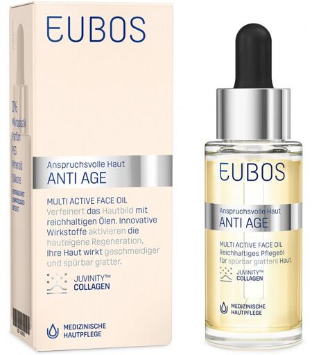 Anwendungsgebiet von Eubos Anti Age Multi Active Face OilDas Eubos Anti Age Multi Active Face Oil ist ein reichhaltiges Pflegeöl - rein vegan - für normale bis trockene Haut, bestehend aus natürlichen Ölen und innovativen Wirkstoffen. Es verbessert die Hautstruktur, stärkt die Barrierefunktion und verfeinert das Hautbild. Das Pflegeöl versorgt die Haut mit wertvollen Lipiden, die Haut wirkt spürbar glatter und geschmeidiger. Es zieht schnell ein und hinterlässt keinen störenden Fettfilm.Wirkungsweise von Eubos Anti Age Multi Active Face OilVerbessert die Hautstruktur und verfeinert das Hautbild. Die Haut wird mit wertvollen Lipiden versorgt, wirkt spürbar glatter und geschmeidiger.Wirkstoffe / Inhaltsstoffe / ZutatenInhaltsstoffe von Eubos Anti Age Multi Active Face Oil: