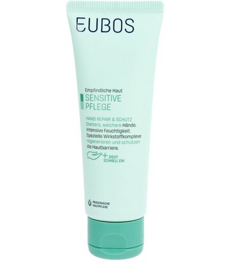 Anwendungsgebiet von Eubos Sensitive Hand Repair+schutz CremeEubos Sensitive Hand Repair+schutz Creme regeneriert strapazierte Haut und spendet intensive Feuchtigkeit. Das Hautbild wird gestrafft und verfeinert. Ein dünner Schutzfilm bewahrt die Haut vor schädlichen Umweltfaktoren. Bei regelmäßiger Anwendung fördert Eubos Sensitive Hand Repair+schutz Creme ein seidiges und weiches Hautgefühl.Wirkungsweise von Eubos Sensitive Hand Repair+schutz CremeEubos Sensitive Hand Repair+schutz Creme enthält eine spezielle Aktiv-Formel. Aminosäuren, Urea und Glycerin verbessern und stabilisieren nachhaltig den Feuchtigkeitsgehalt der Haut. Dank Vitamin-Pflegekomplex mit Provitamin B5, Vitamin E, Allantoin sowie pflegenden Additiven wird die Haut geschützt und die natürliche Biosphäre regeneriert.