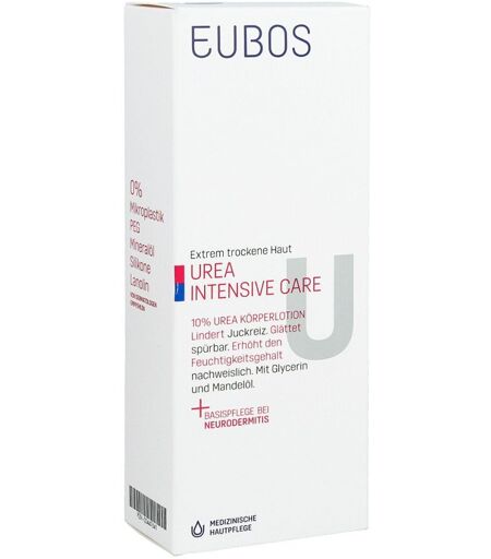 Anwendungsgebiet von Eubos Trockene Haut Urea 10% KörperlotionEubos Trockene Haut Urea 10% Körperlotion ist die medizinische Spezialpflege für extrem trockene, juckende und schuppige Haut. Eubos Trockene Haut Urea 10% Körperlotion kann außerdem für die therapiebegleitende Pflege bei Neurodermitis, Psoriasis und Diabetes angewendet werden. Eubos Trockene Haut Urea 10% Körperlotion unterstützt aktiv die Abschuppung Ihrer Haut und lindert lästigen Juckreiz. Ein feiner Lipidfilm legt sich auf Ihre Haut, um sie vor weiteren schädlichen Umwelteinflüssen zu schützen. Da sich der Feuchtigkeitsgehalt trockener Haut durch die regelmäßige Anwendung von Eubos Trockene Haut Urea 10% Körperlotion deutlich erhöht, fühlt sich Ihre Haut wieder spürbar glatt und weich an. Wirkungsweise von Eubos Trockene Haut Urea 10% KörperlotionDas in Eubos Trockene Haut Urea 10% Körperlotion enthaltene Süßmandelöl verbessert die Hautelastizität, stärkt die Hautbarriere und wirkt hautberuhigend sowie schützend. Glycerin unterstützt die Haut bei der Wasserspeicherung und wirkt glättend. Das in Eubos Trockene Haut Urea 10% Körperlotion enthaltene Allantoin wirkt entzündungshemmend und fördert somit die Heilung kleinerer Hautschäden.Wirkstoffe / Inhaltsstoffe / ZutatenInhaltsstoffe von Eubos Trockene Haut Urea 10% Körperlotion: