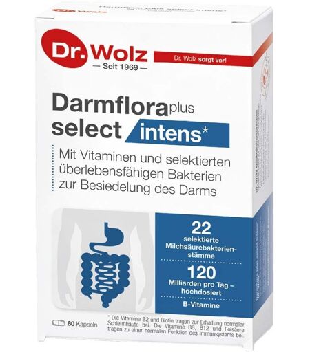 Nahrungsergänzungsmittel sind kein Ersatz für eine ausgewogene, abwechslungsreiche Ernährung und eine gesunde Lebensweise. B-Vitamine und überlebensfähige Bakterien zur Besiedelung des Darms 22 hochwertige Stämme, in über 100 Studien getestet – hochdosiert mit 120 Milliarden Bakterien pro Tag Optimal geschützt durch magensaftresistente Kapseln und stabil gegenüber AntibiotikaDarmflora plus select intens* enthält 22 ausgewählte Milchsäurebakterienstämme mit 120 Milliarden Bakterien pro Tagesportion sowie B-Vitamine zur Unterstützung der Schleimhäute, einschließlich der Darmschleimhaut1. Die Bakterien sind besonders resistent gegen Magen- und Gallensäure. Diese Bakterienstämme kommen natürlicherweise im menschlichen Darm vor. Die B-Vitamine unterstützen die Schleimhäute1 und stärken das Immunsystem2 . Die Kapseln können auch während einer Antibiotika-Therapie eingenommen werden.* 1 Die Vitamine B2 und Biotin tragen zur Erhaltung normaler Schleimhäute bei (z. B. der Darmschleimhaut). 2 Die Vitamine B6, B12 und Folsäure tragen zu einer normalen Funktion des Immunsystems bei.Zutaten:Kapselinhalt: lebende Milchsäurebakterien 69,3% (Lactobacillus acidophilus,Lactococcus lactis, Bifidobacterium lactis, Lactobacillus salivarius, Lactobacillus reuteri,Lactobacillus delbrueckii subsp. bulgaricus, Bifidobacterium breve, Lactobacillusgasseri, Lactobacillus fermentum, Lactobacillus rhamnosus, Bifidobacterium longum,Bifidobacterium infantis, Lactobacillus brevis, Streptococcus thermophilus, Lactobacillusparacasei, Lactobacillus casei, Lactobacillus plantarum, Bifidobacterium bifidum);Trennmittel: Cellulose; Vitamine: B6, B2, B1, B12, Folsäure, Biotin. Kapsel hülle: HydroxypropylmethylcelluloseNährwerte: pro 2 Kapselnpro 4 KapselnVitamin B10,55 mg (50 %*)1,1 mg (100 %**)Vitamin B20,70 mg (50 %*)1,4 mg (100 %**)Vitamin B60,70 mg (50 %*)1,4 mg (100 %**)Vitamin B121,25 µg (50 %*)2,5 µg (100 %**)Biotin25 µg (50 %*)50 µg (100 %**)Folsäure100 µg (50 %*)100 µg (100 %**)Milchsäurebakterien430 mg 50 Mrd.860 mg 100 Mrd.* Tagesbedraftsdeckung bei 2 Kapseln** Tagesbedraftsdeckung bei 4 Kapseln in Prozent der Refernzmenge für die tägliche ZufuhrVerzehrempfehlung:Tagesmenge 4 Kapseln.Je 2 Kapseln morgens und abendszu einer Mahlzeit mit Flüssigkeit.Im Dauergebrauch kann die Tagesmenge auf 1-2Kapseln reduziert werden.Kinder zwischen 2 und 10 Jahren jeweils die halbe Menge.Während der Antibiotikum-Therapie sollte Darmflora plus select intensiv mit einemmöglichst großen Zeitabstand zu dem Antibiotikum eingenommen werden.Hinweis:Die angegebene empfohlene tägliche Verzehrmenge darf nicht überschritten werden.Lagerung:Außerhalb der Reichweite von kleinen Kindern lagern.Nettofüllmenge:80 Kapseln = 30 gHersteller:Dr.Wolz Zell GmbHMarienthaler Str.365366 Geisenheim ...