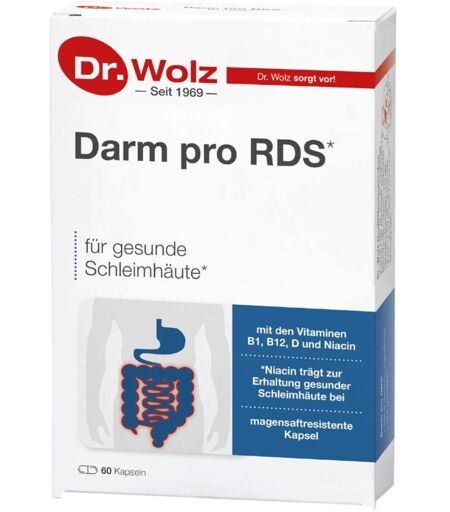 Anwendungsgebiet von Darm Pro Rds magensaftresistente KapselnDarm Pro Rds magensaftresistente Kapseln - Mit Spezialhefe und wertvollen Vitaminen Häufiges Unwohlsein, Blähbauch, Durchfall oder Verstopfung? Ein gereizter Darm kann die Lebensqualität erheblich beeinträchtigen. Schätzungsweise leiden rund 12 Millionen Deutsche – insbesondere Frauen – unter Reizdarm und damit verbundenen Beschwerden. Zudem kann die Nährstoffaufnahme eingeschränkt sein, weshalb eine gezielte Zufuhr bestimmter Vitamine sinnvoll ist. Darm Pro Rds magensaftresistente Kapseln enthält Niacin, verschiedene B-Vitamine und die Spezialhefe Saccharomyces cerevisiae CNCM I-3856, die in verschiedenen Studien getestet wurden. Wertvoll ist besonders das enthaltene Niacin, das die Schleimhäute des Darmes unterstützt*. Dank der magensaftresistenten Kapselhülle aus pflanzlicher Cellulose werden die Inhaltsstoffe gezielt freigesetzt – ideal zur täglichen Einnahme. * Niacin trägt zur Erhaltung normaler Schleimhäute bei (z. B. der Darmschleimhaut). Vitamin B1 (Thiamin) trägt zu einer normalen Funktion des Nervensystems bei. Vitamin B12 trägt zu einer normalen Funktion des Immunsystems bei. Erfahrung & Qualität seit 1969 Unser traditionsreiches Familienunternehmen Dr. Wolz Zell GmbH ist seit über 55 Jahren auf dem Gebiet der Gesundheitsprävention und -erhaltung tätig & produziert nur Präparate, deren Inhaltsstoffe wissenschaftlich erforscht sind & deren Wirkung erwiesen ist. Alle Präparate enthalten natürliche Inhaltsstoffe, für deren Herkunft nur die Quelle der Natur verwendet wird. Besonderer Wert wird auch auf eine gute Bioverfügbarkeit der natürlichen Substanzen gelegt. Wirkstoffe / Inhaltsstoffe / ZutatenZutaten von Darm Pro Rds magensaftresistente Kapseln: