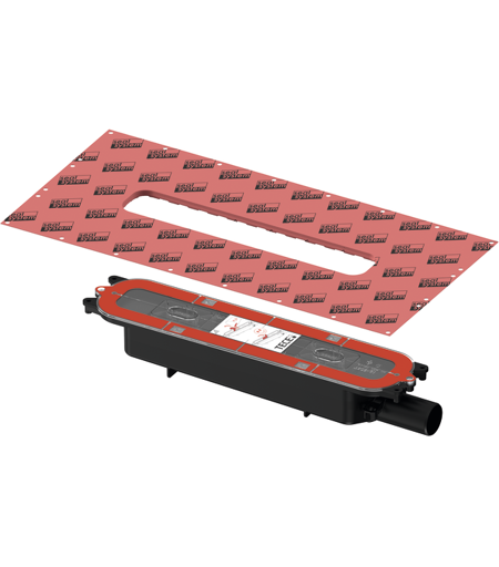 "TECEdrainprofile Ablauf ""flach"", DN 40 Auslauf seitlich Ablauf für TECEdrainprofile Duschprofile, zum Einbau im Estrich, zum seitlichen Anschluss an eine DN 40 Abwasserleitung. Mit werkseitig befestigter und klickbarer Seal System Dichtmanschette, zur Ausführung eines DIN 18534 konformen Anschlusses an die Verbundabdichtung. min. Aufbauhöhe 65 mm (Unterkante Ablauf bis Oberkante Estrich) Ablaufleistung >= 0,48/>= 0,56 l/s (nach EN 1253 bei 10/20 mm Aufstau über Profildeckel) Sperrwasserhöhe 25 mm Geruchsverschluss entnehmbar Estrichverankerung integriert werkseitig befestigte, klickbare und flexible Dichtmanschette mit Seal System passend vorgefertigter Schallschutzstreifen Bauschutzabdeckung verschiebbare/bewegliche Dichtung zur Verbindung mit TECEdrainprofile Duschprofil und zum Ausgleich von Bautoleranzen Bestell-Nr.: 673001 Masse: Länge: 459mm Breite: 96mm Höhe: 65mm Gewicht: 0,819kg Verwendungshinweis: Bitte separat bestellen: Wand- und Bodenmontagehalter oder Montagefüße (optional) Schallschutzmatte Drainbase (optional)" ...