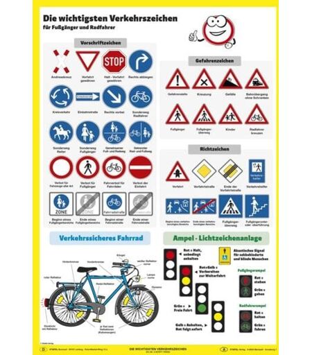 Umweltfreundliches Lernposter in DIN A1 für das Kinderzimmer gedruckt auf hochwertigem Papier aus nachhaltiger Forstwirtschaft Druckfarben und Schutzlack erfüllen die Norm für Kinderspielzeug EN71/3 - die wichtigsten Verkehrszeichen für Fußgänger und Radfahrer - Vorschrifts-, Gefahren- und Richtzeichen - Ampel- und Lichtzeichenanlagen mit Erklärung - Abbildung eines verkehrssicheren Fahrrads ...
