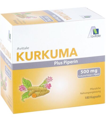 Anwendungsgebiet von Kurkuma 500 mg+Piperin KapselnAvitale Kurkuma Plus Piperin - Mit 500mg Kurkuma-Pulver und Pfefferfruchtextrakt (Piperin)Kurkuma 500 mg+Piperin Kapseln sind ein Nahrungsergänzungsmittel mit 500 mg Kurkuma + Piperin. Curcuma longa gehört zur Pflanzenfamilie der Ingwergewächse und wird auch Gelbwurz genannt. Die Pflanze ist in Südost-Asien und Indien heimisch. Dort wird sie kultiviert und zu Gewürzen sowie Currymischungen, oft in Kombination mit Pfeffer, verarbeitet. Sie ist prägend für die indische Küche. Traditionell kommt Kurkuma als Lebensmittel im Ayurveda – etwa als Bestandteil der „goldenen Milch“ – seit langem zur Anwendung. Ähnlich wie Ingwer hat Kurkuma knollenförmige, gelborange, unterirdische Wurzelstöcke (Rhizome). Nach der Ernte werden die Wurzelstöcke getrocknet und zu Pulver vermahlen.Avitale Kurkuma Kapseln werden ohne tierische Bestandteile produziert und sind glutenfrei, laktosefrei sowie sojafrei.Wirkstoffe / Inhaltsstoffe / ZutatenZutaten von Kurkuma 500 mg+Piperin Kapseln:71,4% Kurkumawurzelstockpulver (Curcuma longa), Hydroxypropylmethylcellulose (Kapselhülle), Reismehl, Trennmittel: Siliciumdioxid 0,03% Schwarzer Pfefferfruchtextrakt (Piper Nigrum, enthält 95% Piperin) Inhalt:1 Kapsel3 Kapseln (Tagesdosis)Kurkuma-Pulver500,00 mg1.500,00 mgPfefferfruchtextrakt0,233 mg0,70 mgdavon 95% Piperin0,22 mg0,66 mgGegenanzeigenBei bekannter Überempfindlichkeit gegenüber einen der oben genannten Inhaltsstoffe sollte das Produkt nicht angewendet werden.DosierungVerzehrempfehlung von Kurkuma 500 mg+Piperin Kapseln:3 x 1 Kapsel täglich nach den Mahlzeiten mit Flüssigkeit einnehmen.Tipp: Kurkuma ist fettlöslich und kann daher vom Körper besser mit fett- oder lecithinhaltiger Kost wie Vollmilch oder Sojamilch aufgenommen werden.Kurkuma ist ein Naturprodukt, die Farbe des Pulvers kann daher leicht variieren. Bitte die Kapseln nicht öffnen, da das enthaltene Kurkuma-Pulver stark färbt. Eventuelle Rückst ...