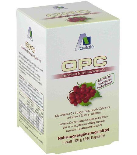 Nahrungsergänzungsmittel sind kein Ersatz für eine abwechslungsreiche und ausgewogene Ernährung und eine gesunde Lebensweise. Nahrungsergänzungsmittel mit OPC-reichem Traubenkernextrakt sowie den Vitaminen C und EDer eingesetzte Traubenkernextrakt wird mit einem besonders schonenden Verfahren ausschließlich aus Traubenkernen von Früchten aus Frankreich produziert und auf einen OPC-Gehalt von mindestens 60% eingestellt.Die Vitamine C und E tragen dazu bei, die Zellen vor oxidativem Stress zu schützen. Vitamin C unterstützt die normale Funktion des Immunsystems und trägt zu einer normalen Kollagenbildung für eine normale Funktion der Haut bei.Zutaten: OPC-reicher Traubenkernextrakt, Inulin, Kapselhülle: Hydroxypropylmethylcellulose, Vitamin C, Vitamin E, Trennmittel: Magnesiumsalze der Speisefettsäuren, Farbstoff : (Kapselhülle).Das Produkt ist frei von Soja, Laktose und Gluten. Zusammensetzung pro Kapsel Traubenkernextrakt 200 mg Vitamin C 30 mg Vitamin E 5 mg Verzehrempfehlung:1-2 Kapseln täglich mit einem Glas Wasser zu einer Mahlzeit einnehmen.Die Kapselhülle kann auseinander gezogen werden um das Pulver einzunehmen. Hinweis:Die angegebene empfohlene Tagesmenge darf nicht überschritten werden. Aufbewahrung: Kühl (6-25 °C) und lichtgeschützt lagern. Außerhalb der Reichweite von kleinen Kindern aufbewahren.Nettofüllmenge:240 Kapseln / 108gHersteller:Avitale by Mikro-Shop Handels GmbHCarl-Zeiss-Straße 825451 Quickborn ...