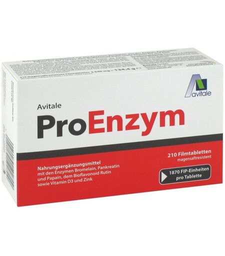 Anwendungsgebiet von ProEnzym magensaftresistente TablettenProEnzym - Magensaftresistente Filmtabletten - 1870 FIP-Einheiten pro TabletteDurch den Verzicht auf Farbstoffe, insbesondere den weißfärbenden Stoff Titandioxid im Überzug unserer Avitale ProEnzym Tabletten, haben diese jetzt eine hellgrüne Färbung. Dieser Farbton entsteht durch die natürliche Farbgebung der enthaltenen Enzyme. Die Rezeptur bleibt sonst unverändert wie zuvor! ProEnzym magensaftresistente Tabletten sind Nahrungsergänzungsmittel mit den Enzymen Bromelain aus der Ananas, Pankreatin, Papain aus der Papaya, dem Bioflavonoid Rutin sowie Vitamin D3 und Zink.Avitale ProEnzym Tabletten enthalten eiweißspaltende Enzyme wie Papain und Bromelain sowie Vitamin D und den Mineralstoff Zink. Papain wird aus den Früchten des „Carica Papaya“-Baumes gewonnen, welcher zur Familie der Melonenbaumgewächse gehört. Bromelain findet sich in hoher Konzentration in der Frucht des Ananasbaumes (Ananas comosus). Vitamin D und der Mineralstoff Zink tragen zu einer normalen Funktion des Immunsystems bei, leisten einen Beitrag zur Erhaltung normaler Knochen und haben eine Funktion bei der Zellteilung. Vitamin D leistet weiterhin einen Beitrag zur Erhaltung einer normalen Muskelfunktion und Zink trägt dazu bei, die Zellen vor oxidativem Stress zu schützen. Wirkstoffe / Inhaltsstoffe / ZutatenProEnzym magensaftresistente Tabletten enthält:Zutaten: Inulin, Papain aus der Papaya (Trägerstoff: Laktose), Rutin, Bromelain aus der Ananas (Trägerstoff: Maltodextrin), Überzugsmittel: Schellack, Ammoniumhydrogencarbonat, Carboxymethylcellulose Natrium, Talkum, pflanzliches Öl (Kokosnuss), Glycerin Pankreatin, Trennmittel: Tri-Calciumphosphat und Calciumsalze der Speisefettsäuren (pflanzlich) Zinkcitrat, Cholecalciferol Allergene: Das Produkt enthält Laktose.Inhalt pro Tablette: 100mg Papain 16mg Pankreatin 100mg Rutin 0,834mg Zink (8,334% NRV*) 75mg Bromelain 0,417mcg Vitamin D3 (8,334% NRV*) Die en ...