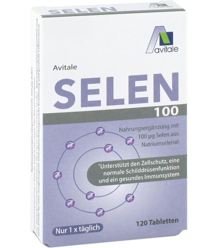 Anwendungsgebiet von Selen 100 mg TablettenSelen 100mcg Tabletten mit 100 mcg Selen als Natriumselenat zur Unterstützung des Zellschutzes, einer normalen Schilddrüsenfunktion sowie einem gesunden Immunsystem*Selen 100 mg Tabletten sind ein Nahrungsergänzungsmittel mit 100mcg Selen als Natriumselenat. Selen kommt sowohl in tierischen als auch in pflanzlichen Nahrungsmitteln vor. Der menschliche Körper kann es nicht selbst bilden, er muss es regelmäßig über selenhaltige Lebensmittel aufnehmen. Avitale Selen Tabletten liefern mit 100 mcg Selen als Natriumselenat eine gute Versorgung wichtiger Körperfunktionen mit diesem essentiellen Spurenelement.Selen trägt dazu bei: die Zellen vor oxidativem Stress zu schützen*eine normale Schilddrüsenfunktion zu unterstützen*die normale Funktion des Immunsystems zu fördern*Selen ist außerdem hilfreich zu:dem Erhalt normaler Haare und Nägeleiner normalen SpermabildungAvitale Selen 100mcg Tabletten sind glutenfrei, lactosefrei, sojafrei, hefefrei und ohne Farbstoffe.Pro 1 Tablette (Tagesdosis) sind 100mcg Selen als Natriumselenat enthalten.Wirkstoffe / Inhaltsstoffe / ZutatenZutaten von Selen 100 mg Tabletten:Zutaten: Füllstoff: Dextrose Trennmittel: Tricalciumphosphat und Calciumsalze der Speisefettsäuren (pflanzlich) NatriumselenatInhalt pro Tagesdosis (1 Tablette):100 mcg Selen (182% NRV*)NRV* = % des Nährstoffbezugswerts (NRV=nutrient reference value) gemäß EU-LebensmittelinformationsverordnungGegenanzeigenBei bekannter Überempfindlichkeit gegenüber einen der oben genannten Inhaltsstoffe sollte das Produkt nicht angewendet werden.DosierungVerzehrempfehlung von Selen 100 mg Tabletten: 1 Tablette täglich mit einem Glas Wasser einnehmen.HinweiseDie tägliche Verzehrempfehlung darf nicht überschritten werden. Nahrungsergänzungsmittel sind kein Ersatz für eine ausgewogene und abwechslungsreiche Ernährung und gesunde Lebensweise. Bitte außerhalb der Reichweite von kleinen Kindern aufbewahren. Bitte t ...