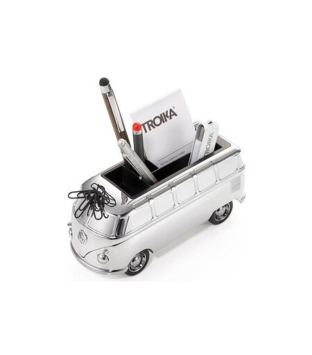 Stiftehalter im VW Bulli DesignDer TROIKA® Stiftehalter FOREVER T1 bringt mit dem ikonischen VW Bulli T1 Samba Bus (Baujahr 1962) ein Stück Nostalgie auf den Schreibtisch. Gefertigt aus verchromtem Metallguss in Schwarz-Silber vereint er Designobjekt und praktische Organisation. Mehr als nur ein StifteköcherDer Bulli bietet ein integriertes Fach für Smartphones, Platz für Visitenkarten sowie Fächer für Stifte, Schere, Lineal oder andere Utensilien. Ein Magnet für Büroklammern ist ebenfalls integriert. Zusätzlich sind 5 Büroklammern im Lieferumfang enthalten. Besondere KombinationDer Stiftehalter verbindet den Charme des Klassikers mit moderner Funktionalität – ein echter Blickfang für jeden Schreibtisch. Maße: 16 x 4 x 7,9 cm. Bringen Sie Ordnung und Stil an Ihren Arbeitsplatz – mit dem TROIKA® Stiftehalter FOREVER T1 im legendären VW Bulli Design. ...