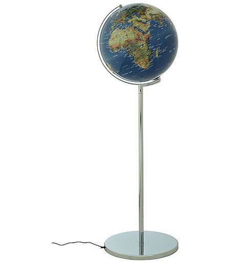 Mit seiner hochwertigen Gestaltung inklusive LED-Licht schafft der englischsprachig beschriftete Standglobus SOJUS LIGHT einen attraktiven Blickfang in privaten Wohnbereichen ebenso wie in Geschäftsräumen. Der stabile Fuß, das verchromte Metallgestell und die glänzende Weltkugel mit ihren reliefartig ausgearbeiteten Gebirgen strahlen dabei maximale Exklusivität aus. In vier Varianten erhältlich passt sich der Globus unterschiedlichsten Raumkonzepten an. Ø 43 cm Durchmesser verchromter Metallfuß, Gesamthöhe 1,32m integrierte Beleuchtung topografische Karte mit Kartenrelief bewegliche Achse, Kunststoff Farbe: glänzend blau/grün ...