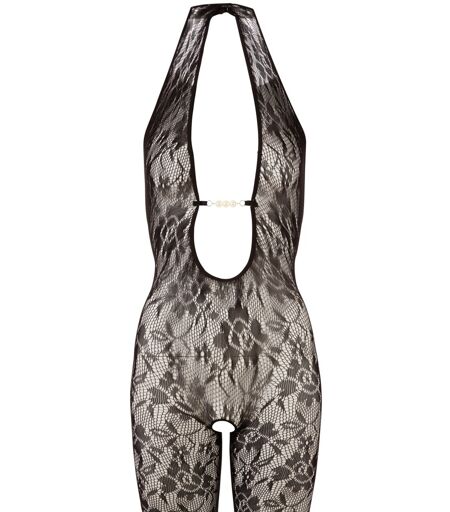 Schwarzer Catsuit aus filigran gearbeitetem Netz, mit Neckholder und drei Perlen am Dekolleté. Im Schritt offen. Mit Fuß. 100% Polyamid. ...