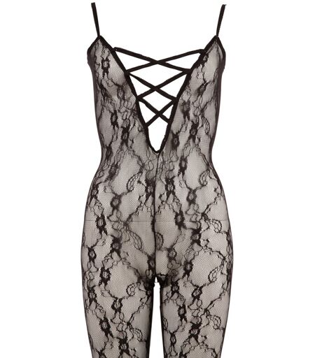 Catsuit aus weicher Effekt-Spitze mit tiefem Stretchband-Dekolleté in Schnüroptik. Im Schritt erregend offen! Mit Fuß. 100% Polyamid. ...