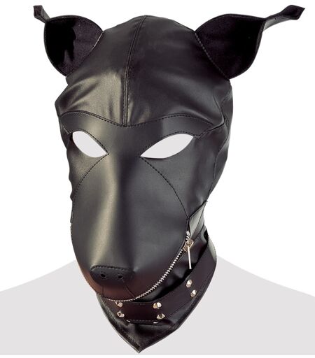 Hundekopf-Maske aus schwarzem Lederimitat mit Reißverschluss über dem Maul. Mit passend verstellbarer Schnürung am Hinterkopf. Halsband mit Nieten und Ring. 100% Polyester, mit Polyurethan-Beschichtung. ...