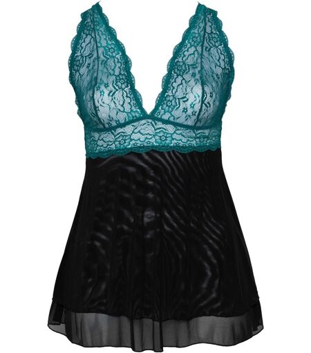 Kurzes Babydoll von Cottelli CURVES in Zweiteiler-Optik mit eng geschnittenem Oberteil aus feiner petrolfarbener Spitze und ausgestelltem Rockteil aus schwarzem doppellagigem Powernet. Verführerisch tief dekolletiert. Raffinierte Träger-Lösung: Die Spitzenträger gehen in 4 schwarze Stretchträger über, die im Rücken mit einem Ring an einem zarten Spitzendreieck verbunden sind. Die Träger sind für perfekte Passform in der Länge verstellbar. 90% Polyamid, 10% Elasthan. ...