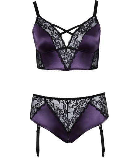 Bralette und Straps-Slip ouvert im Set von Cottelli CURVES im edlen Mix aus lilafarbenen Satin und schwarzer feiner Spitze. Das Bralette punktet mit seinen gekreuzten Stretchbändern im Dekolleté, der Taillen-Slip mit seiner einladenden Öffnung im Schritt. Die elastischen breiten Träger sind verstellbar, genauso wie die Strumpfhalter, die vom Slip auch komplett abnehmbar sind. 90% Polyamid, 10% Elasthan. Lieferung ohne Strümpfe. ...