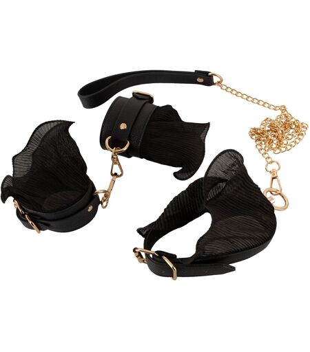 Hochwertiges Bondage-Set von Bad Kitty bestehend aus Halsfessel mit Leine und Handfesseln. In stilvoller Lederoptik mit zarten plissierten Rüschen und goldfarbenen Metalldetails. Alle komfortablen Fesseln im Umfang passend verstellbar. Handfesseln jeweils mit Ring und Karabinerhaken, Halsfessel mit Ring und abnehmbarer Karabiner-Kettenleine mit Handschlaufe. Polyurethan, Metall Rüschen 100% Polyester. ...