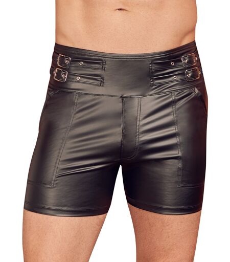 Schwarze Shorts von NEK im trendigen Mattlook mit extra hohem Bund (High Waist), der jeweils seitlich mit zwei verstellbaren Schnallenriemen versehen ist. Vorne mit praktisch-erotischem, unterlegtem Reißverschluss zum Öffnen. Herrlich elastisch für hervorragenden Tragekomfort. 90% Polyester, 10% Elasthan, Polyurethan-Beschichtung. ...