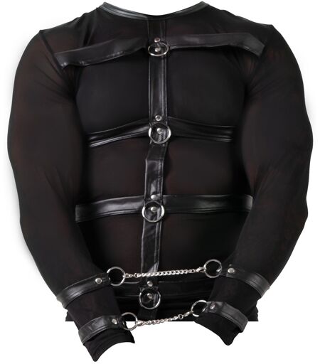 Langarm-Shirt von Svenjoyment Bondage aus elastischem weichem Powernet mit aufgestepptem und mit Ringen besetztem Harness vorne. Rücken komplett im trendigen Mattlook. Lange Powernet-Ärmel am Ende mit aufgesteppten Mattlook-Fesselriemen, die mit Ringen versehen sind, in die beiliegende kurze Verbindungskette mit den Karabinern handfesselnd eingehakt werden kann. 90% Polyester, 10% Elasthan Powernet 90% Polyamid, 10% Elasthan. ...
