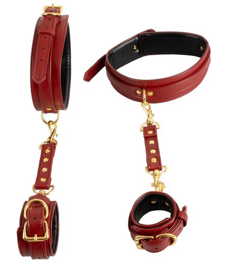 Kombinierte Hand- und Beinfessel von Bad Kitty in edler Optik aus rotem Lederimitat mit goldfarbenen Metall-Elementen. Die beiden verstellbaren, leicht gepolsterten Riemen für Oberschenkel und Handgelenk sind mit einem abnehmbarem Karabiner-Riemen miteinander verbunden. 1 Paar. Handriemen im Umfang verstellbar von 13 bis 21 cm. Oberschenkelriemen im Umfang verstellbar von 41 bis 60 cm. Verbindungsriemen mit Karabiner 18 cm lang. Polyurethan, Metall. ...