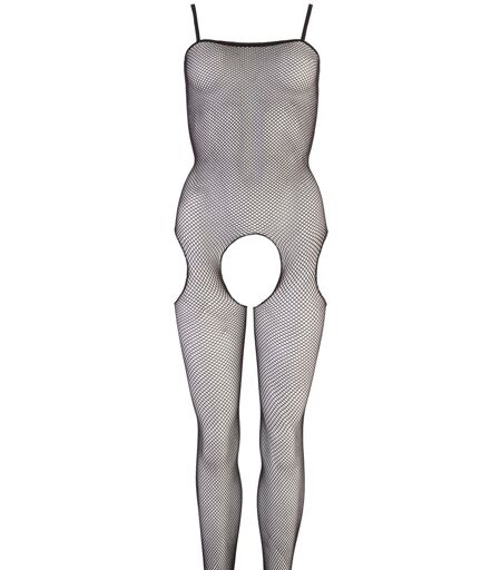Netz-Catsuit aus schwarzem Stretch-Netz. Hier wird nichts der Fantasie überlassen. Im Schritt und seitlich provozierend offen. Schmale Träger. Mit Fuß. Nahtlos gefertigt. 100% Polyamid. ...