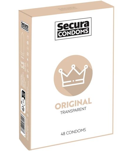 Transparente, seidig glatte Kondome Original von Secura Condoms. Mit Feuchtbeschichtung auf Silikonbasis und Reservoir. Geruchs- und geschmacksneutral. Länge 180 mm, Nennbreite 53 mm. 48 Stück. ...