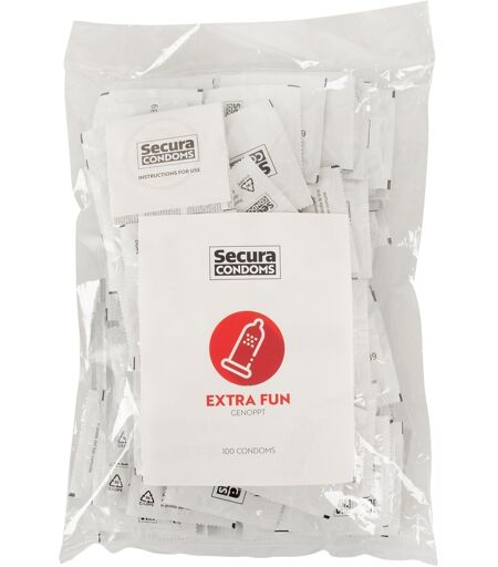 Transparente Kondome Extra Fun von Secura Condoms mit aufregenden Stimulationsnoppen. Mit Feuchtbeschichtung auf Silikonbasis und Reservoir. Veganfreundlich. Geruchs- und geschmacksneutral. Länge 180 mm, Nennbreite 53 mm. 100 Stück. ...