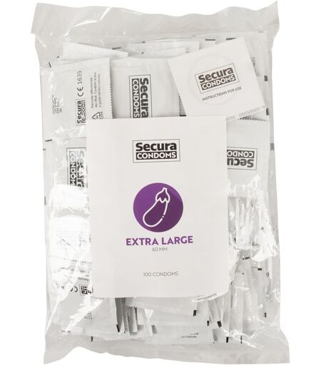 Transparente, seidig glatte Kondome Extra Large von Secura Condoms mit mehr Format und Komfort für den größeren Penis. Mit Feuchtbeschichtung auf Silikonbasis und Reservoir. Veganfreundlich. Geruchs- und geschmacksneutral. Länge 180 mm, Nennbreite 60 mm. 100 Stück. ...