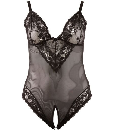 Edler Body ouvert aus semitransparentem Powernet mit verstellbaren Trägern. Mit zarter Blütenspitze an den Cups, die in Richtung Körpermitte spitz ausläuft. Die Beinabschüsse vorne und hinten sind ebenfalls mit Blütenspitze verziert. 90% Polyamid, 10% Elasthan. ...
