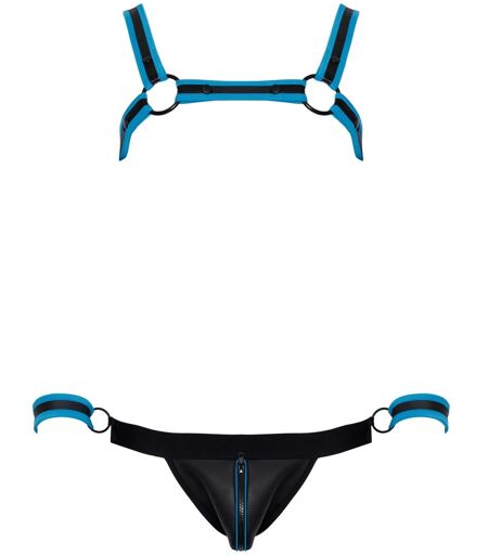 Brustharness, Jock und 2 Handfesseln im Set von Svenjoyment BONDAGE. Extravagante Neopren-Optik in Schwarz mit royalblauen Kontrasten. Harness mit Druckknöpfen schnell an- und abgelegt. Pofreier Jock mit unterlegtem Reißverschluss im Beutel. Am Bund jeweils seitlich ein Ring für die beiliegenden Handfesseln mit verstellbaren Klettverschlüssen. 90% Polyester, 10% Elasthan, Polyurethan-Beschichtung. ...