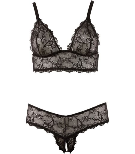 Filigrane schwarze Spitze: zarter Soft-BH ohne Verschluss und mit verstellbaren Trägern plus raffinierter String mit offenem Schritt für leidenschaftliche Stunden zu zweit. 90% Polyamid, 10% Elasthan. ...