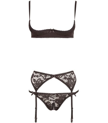 Hebe, Riostring ouvert und Strapsgurt im Set. Alle drei Teile aus schwarzer, elastischer Spitze. Hebe mit leicht gepolsterten Bügel-Cups, Riostring im Schritt erregend offen. 90% Polyamid, 10% Elasthan. Ohne Strümpfe. ...