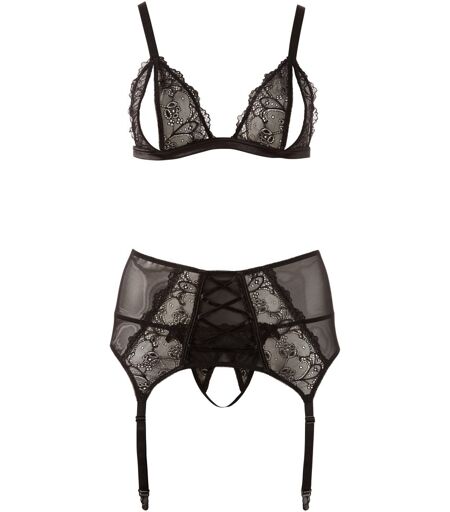 Soft-BH mit offenen Cups, verstellbaren Trägern und Hakenverschluss hinten. Strapsgurt mit Zierschnürungen und vier verstellbaren Strapsen. Dazu passender String. 90% Polyamid, 10% Elasthan. Ohne Strümpfe. ...