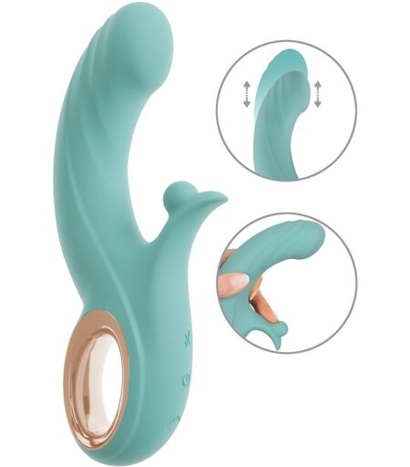 Der handliche Thrusting Vibrator with Vibrating Clit Ball von GoSoft kombiniert kraftvolle Stöße mit intensiven Vibrationen für doppeltes Vergnügen – innen wie außen! Sein geschwungener Wellenschaft trifft die G-Zone in der Vagina zielsicher und stößt dort mit seiner vibrierenden Spitze immer wieder lustvoll zu. Gleichzeitig verwöhnt die außenliegende Vibrationskugel schmeichelnd die Klitoris. Einfach per Knopfdruck zu doppelten Höhenflügen starten! An dem praktischen Haltering steuert man die Funktionen spielend leicht: einzeln oder aufregend miteinander kombiniert – ganz nach Wunsch. Die Spitze und die Vibrationskugel bieten jeweils 10 individuelle Modi, während die Stoßfunktion des Schafts in 7 Geschwindigkeiten anpassbar ist. Alles mit nur wenigen Fingertipps für ein ganz persönliches Stimulations-Programm. Gefertigt aus seidig weichem Silikon gleitet der Vibrator sanft und passt sich flexibel dem Körper an. Einmal richtig positioniert, kann man ihn sogar freihändig genießen und sich voll und ganz dem Moment hingeben! Wiederaufladbar – inklusive USB-Ladekabel. Gesamtlänge 20,5–21 cm Einführlänge 10,6 cm, Ø max. 3,7 cm. Gewicht 221 g. Silikon, ABS. ...