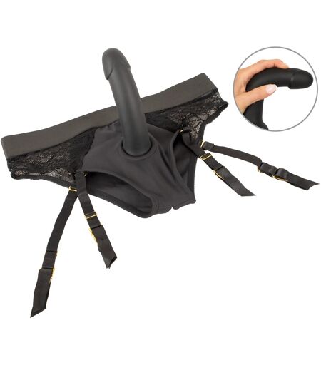 Stilvolles Set von Your Strap-on Collection by You2Toys mit Strap-on-Slip und Dildo. Neben der sinnlichen Optik und dem komfortablen Tragegefühl des Slips punktet das Set mit seiner raffinierten Funktion: Der formschöne Dildo ist schnell und einfach in den Slip eingesetzt, um mit ihm genussvoll zuzustoßen. Und hält fest und sicher auch bei wildesten Stoßvergnügen. Für mehr (und neuen) Spaß zu zweit! Schwarzer Strap-on-Slip im elastischen Material-Mix aus Mikrofaser und Spitze mit hohem Tragekomfort. Vorne doppellagig mit Einschub gearbeitet und mit diskretem Stretch-Haltering zum einfachen Einsetzen des beiliegenden Saugfuß-Dildos. Auch jeder andere Dildo/Vibrator mit Saugfuß (Ø max. 4 cm) kann eingesetzt werden. Über dem Po mit einladendem Cut-out. Die Strumpfhalter sind verstell- und auch komplett abnehmbar. Dehnbarer Taillen-/Hüftumfang bis max. 70 cm. 88% Polyamid, 10% Elasthan, 2% Baumwolle. Der beiliegende puristische Dildo ist aus seidig softem Silikon gefertigt. Dabei angenehm fest und dennoch schön flexibel. Dazu ideal gebogen und mit ausgeformter stilisierter Eichel für G-Punkt bzw. Prostata-Stimulation. Mit seinem Saugfuß ist der Dildo schnell und einfach in die Slip-Front eingesetzt. Der Dildo ist selbstverständlich auch solo bespielbar – der starke Saugfuß haftet auch auf jeder glatten Oberfläche fest und sicher für freihändige Vergnügen. Gesamtlänge 17,5 cm, Einführlänge 14,5 cm, Ø max. 3,9 cm. Silikon. Strümpfe sind nicht im Lieferumfang enthalten. ...