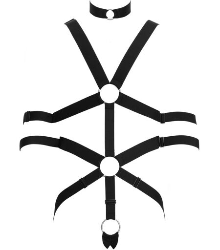 Schwarzer Harness-Body von ORION mit Metall-Penisring und 4 Armfesseln. Harness aus elastischen, weichen Webgummi-Riemen mit großen silberfarbenen Verbindungsringen. Vielfach verstellbar für perfekten hautnahen Sitz. Die Armfesseln sind jeweils seitlich am Harness fest angebracht. Mit ihren Klettverschlüssen sind die Fesselriemen schnell angelegt und angepasst. Cockring-Ø 5 cm (nicht abnehmbar). 100% Elasthan, Metall. ...