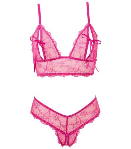 Bralette und Riostring ouvert im Set von La finesse komplett aus feiner pinkfarbener Spitze. Schön elastisch und weich anschmiegsam. Bralette mit Satin-Bindeschleifen zum Öffnen in den geschlitzten Soft-Cups. Die Träger sind passend verstellbar. Der Riostring überrascht mit seinem offenen Schritt. 90% Polyamid, 10% Elasthan. ...