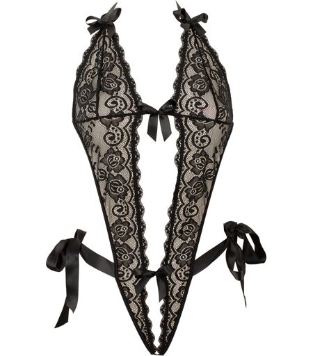 Verführerischer schwarzer Spitzenbody von La finesse mit Satin-Schleifenbändern als Neckholder, im freien Rücken und jeweils seitlich am String. Das Vorderteil aus weicher elastischer Spitze ist komplett offen und wird nur durch zwei Zierschleifen aus Satin zusammengehalten. Oberhalb der Soft-Cups ebenfalls zwei Satin-Zierschleifen als zusätzlicher Blickfang. 90% Polyamid, 10% Elasthan. ...