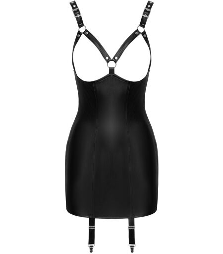 Schmales kurzes, busenfreies Straps-Kleid von ZADO aus weichem Lammleder mit silberfarbenen Metalldetails. Der freiliegende Busen wird von Lederriemen aufregend umrahmt. Spektakuläre Rückansicht mit zwei breiten elastischen Spitzen-Einsätzen und durchgehendem Reißverschluss in der Mitte. Die Träger sind mit Schnallenverschlüssen passend verstellbar. Die 4 verstellbaren Strumpfhalter sind vom Minikleid abnehmbar. Leder (Lamm, chromfrei gegerbt) Spitze 95% Polyester, 5% Elasthan. ...