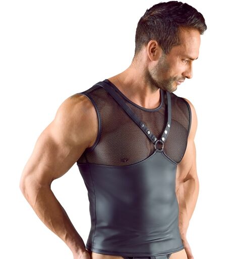 Ärmelloses, betonendes Shirt von Svenjoyment im Brustharness-Style mit Nieten und Ringen. Schwarzer elastischer Material-Mix mit hohem Tragekomfort: stylischer Mattlook und grobmaschiges Netz. 90% Polyester, 10% Elasthan, Polyurethan-Beschichtung Netz 100% Polyester. ...