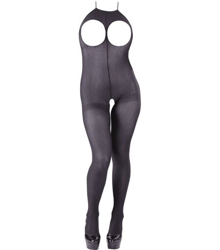 Rückenfreier Catsuit ouvert aus semitransparentem schwarzem Strumpfmaterial. Hochelastisch - schmiegt sich an wie eine zweite Haut! Busen, Schritt und Po liegen komplett frei. Mit Neckholder zum Binden. 100% Polyamid. ...