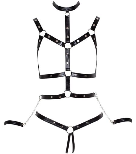 Busenfreier Brustharness und String ouvert im edlen elastischen Wetlook mit dekorativen Flachnieten. Inklusive schmalen Handfesseln, die mit einer kurzen Kette seitlich befestigt werden können. Perfekt geeignet für verruchte Fesselspielchen für Einsteiger und Kenner. 92% Polyester, 8% Elasthan. ...